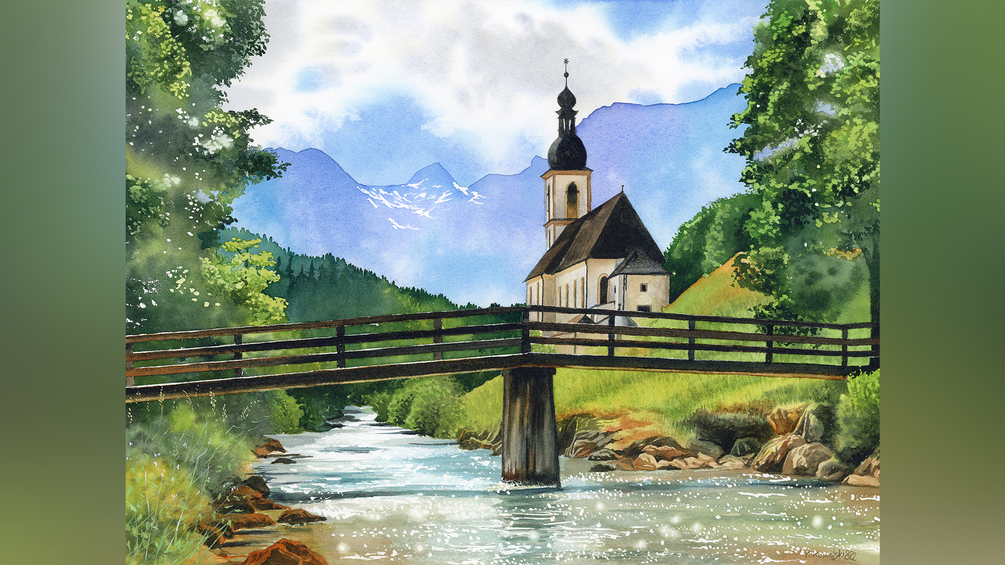 The scene depicts the church of St. Sebastian located in Ramsau, Bavaria, south Germany. In the background we can see the Reiter Alpe and under the bridge there’s the Ramsauer Ache river. You’ll learn lots of techniques helpful to paint landscapes. Give it a go!