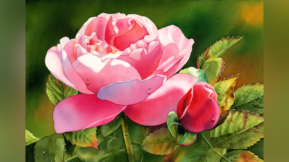 In this tutorial I'll show you how to catch beautiful glowing light on the petals, how to paint rose leaves and how to achieve smooth watercolor background.